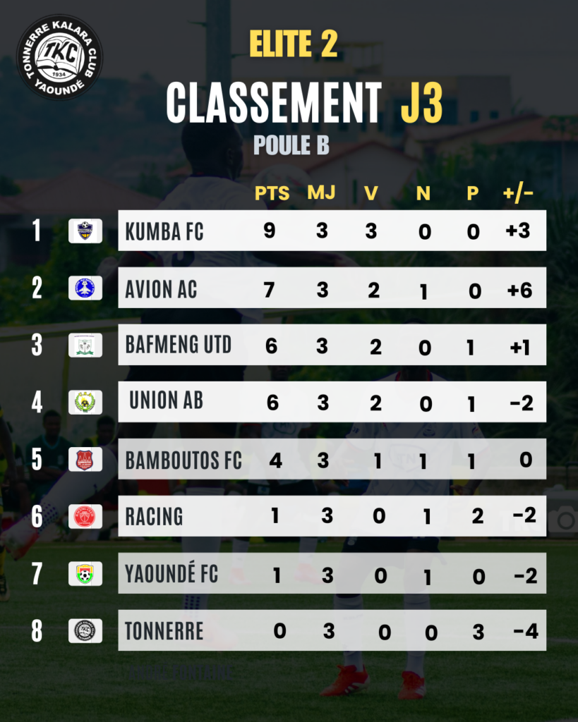 Après trois journées, notre Tonnerre Kalara Club occupe la 8ᵉ place avec 0 point, pour trois matchs et une différence de buts de -4. Kumba FC mène la danse avec 9 points, devant Avion AC (7 pts) et Bafmeng UTD (6 pts), tandis que Union AB complète le Top 4.