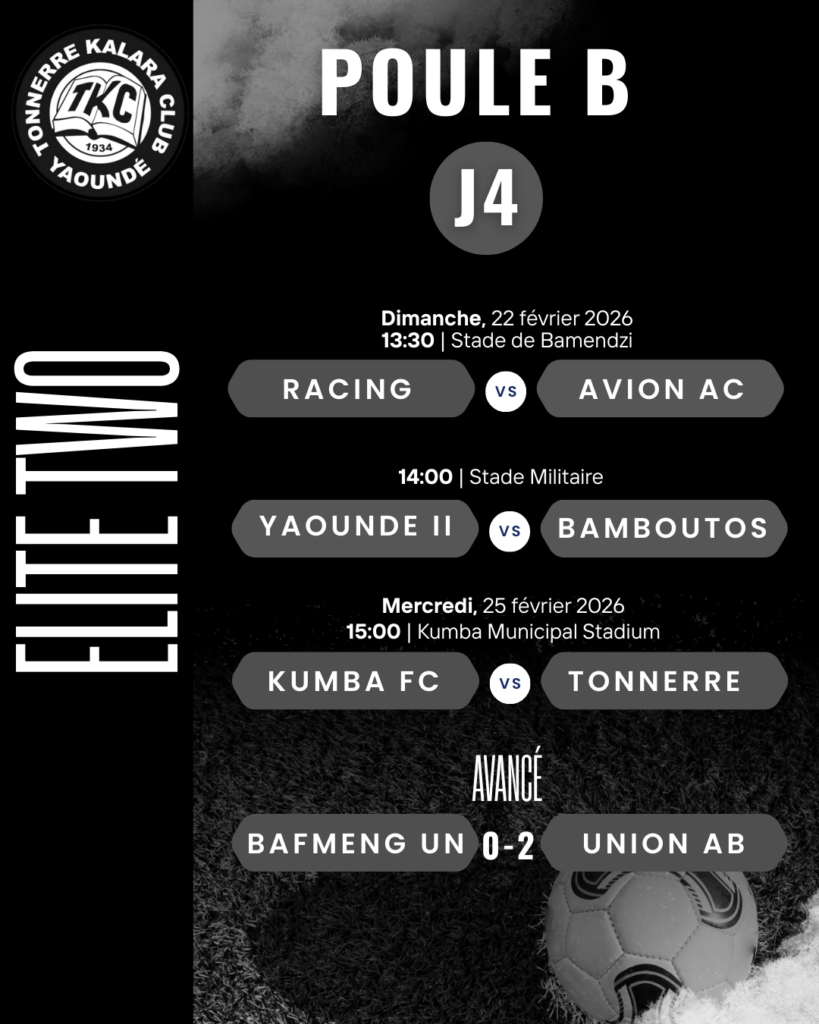 Nos Kalara Boys se préparent pour un nouveau défi en championnat. Ce mercredi 25 février 2026 à 15h, le Tonnerre Kalara Club se déplace au Kumba Municipal Stadium pour affronter Kumba FC, dans le cadre de la 4ᵉ journée de MTN Elite Two, Poule B.
